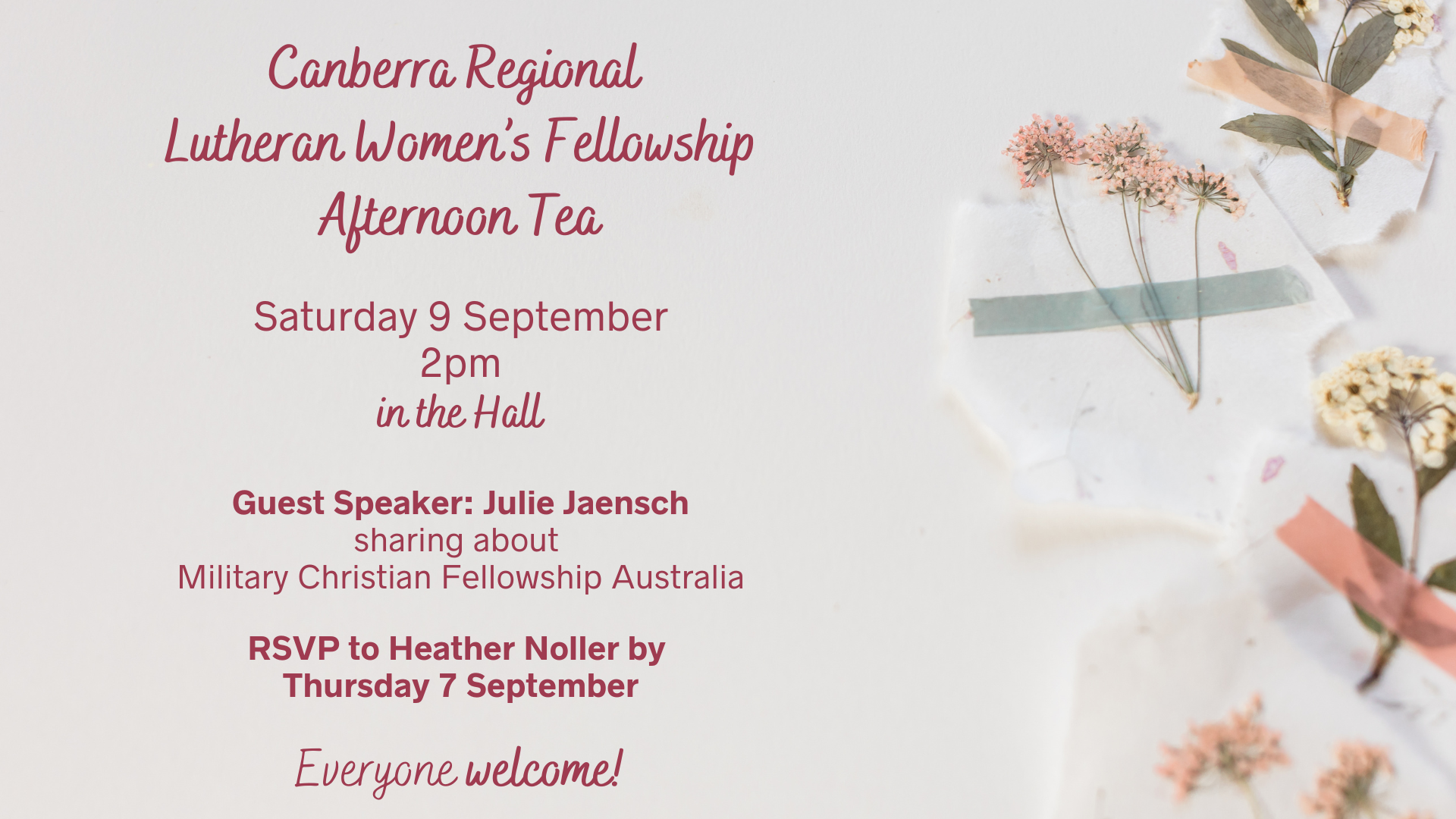 All women are invited to hear our guest speaker, Julie Jaensch, talk about Military Christian Fellowship Australia, and enjoy afternoon tea with women from other Lutheran Congregations in Canberra/Queanbeyan area.