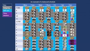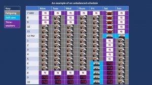 Write out your general week schedule hour by hour, noting the specific activity you are doing, and whether it is providing you energy, fatiguing you, or a self-care activity.