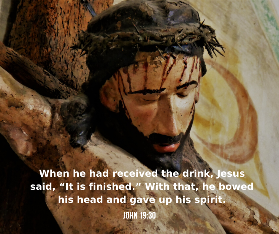 28 Later, knowing that everything had now been finished, and so that Scripture would be fulfilled, Jesus said, “I am thirsty.” 29 A jar of wine vinegar was there, so they soaked a sponge in it, put the sponge on a stalk of the hyssop plant, and lifted it to Jesus’ lips. 30 When he had received the drink, Jesus said, “It is finished.” With that, he bowed his head and gave up his spirit.