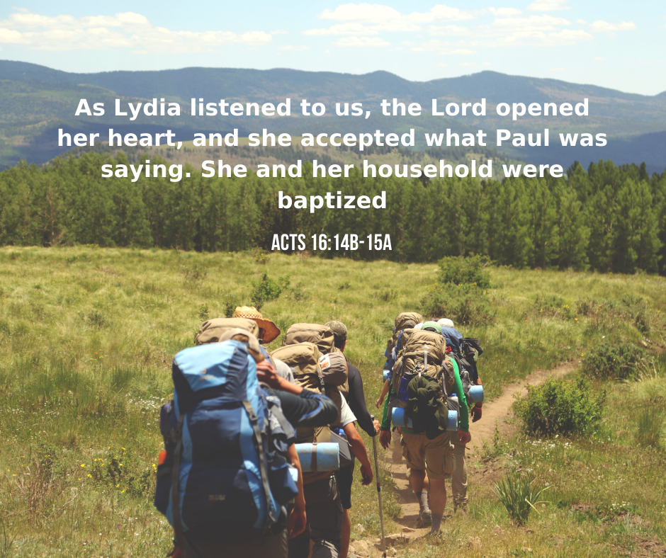 On the Sabbath we went a little way outside the city to a riverbank, where we thought people would be meeting for prayer, and we sat down to speak with some women who had gathered there. One of them was Lydia from Thyatira, a merchant of expensive purple cloth, who worshiped God. As she listened to us, the Lord opened her heart, and she accepted what Paul was saying. She and her household were baptized, and she asked us to be her guests. “If you agree that I am a true believer in the Lord,” she said, “come and stay at my home.” And she urged us until we agreed.